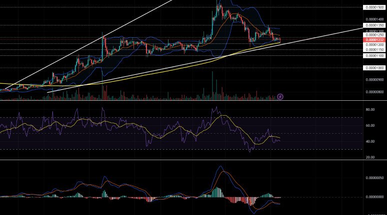 현재 200일 MA에서 가격이 0.00001220달러에 거래되며 국소 되돌림 현상이 9일째 확인되고 있다.