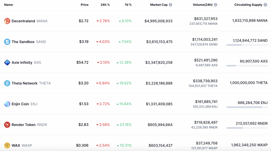 코인마켓캡에 따르면 현재 구매할 수 있는 메타버스 암호화폐는 200개 미만입니다. 본 메타 버스 코인 순위 목록 중 시가총액 5억 달러가 넘는 프로젝트는 아직 10개 이하입니다.