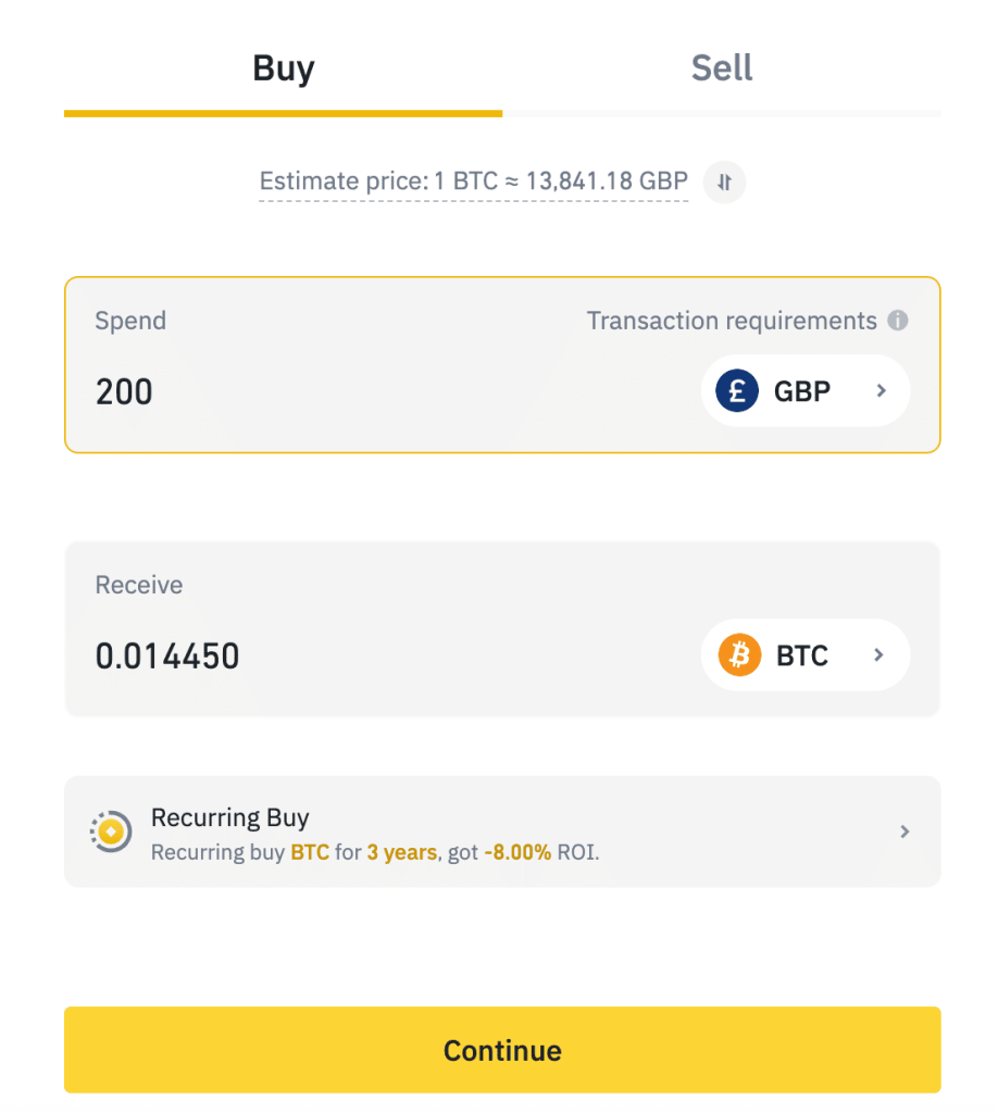 이 가이드에서는 GBP로 비트코인을 구매하지만, 바이낸스는 USD, EUR 같은 다양한 화폐를 지원합니다. 이제 구매할 비트코인 수량을 입력하고, 최소 값이 충족되는지 확인합니다.